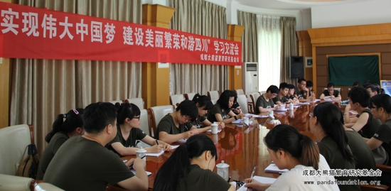 近日,成都大熊猫繁育研究基金会全体工作人员在成都熊猫基地办公室开展“中国梦”专题学习交流会,对个人如何认识中国梦、如何实现中国梦进行了广泛的剖析与交流。学习会议上,基金会领导、党员干部及其他基金会工作人员积极发言、各抒己见,相互学习、讨论。