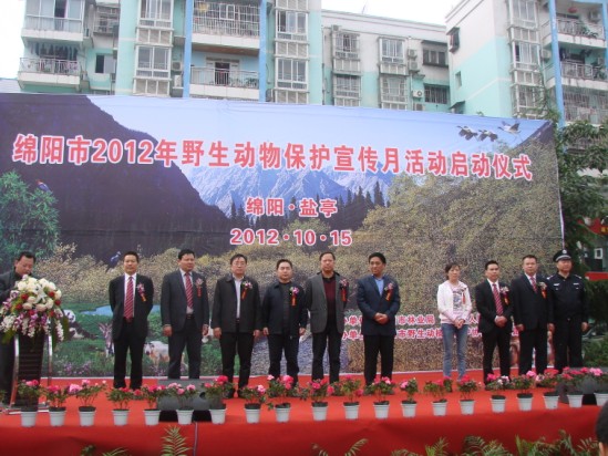10月15日,由绵阳市林业局、盐亭县人民政府举办,绵阳市野生动植物保护协会、盐亭县林业局联合承办的“绵阳市2012年野生动物保护宣传月活动启动仪式”在盐亭县城南门休闲广场举行,也是绵阳举行的第23次野生动物宣传保护活动。今年的主题是“保护野生动物•共建森林绵阳”。市林业局局长陈明世,盐亭县委常委、政法委书记何光明等领导出席启动仪式并讲话,盐亭县委常委、宣传部长卢海兵主持了启动仪式。