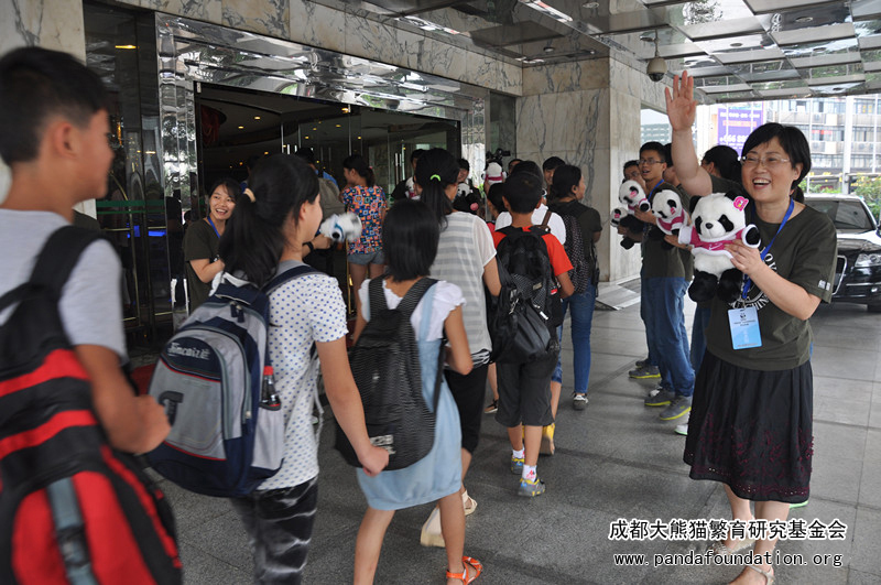 基金会活动工作人员手持我们的使者“大熊猫玩偶”一起迎接来自芦山的同学