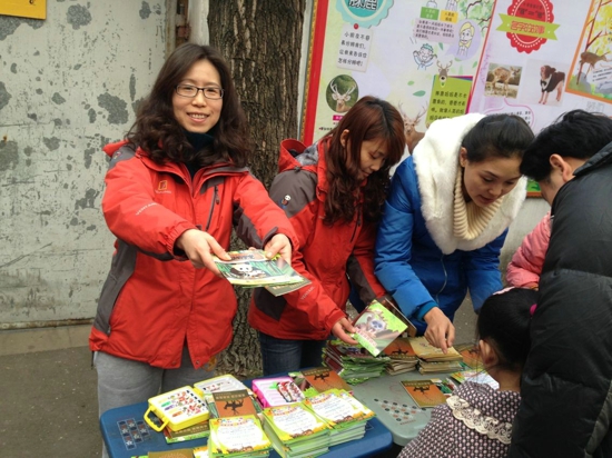 科教部胡彦部长带领工作人员发放《动物宝宝》、《金丝猴育幼》等科普读物