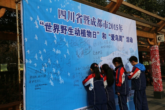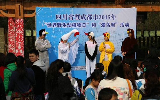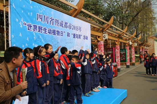 3月13日上午9:30,“世界野生动植物日”暨第34届“爱鸟周”活动在成都动物园正式启动。国家林业局、省林业厅、市林业和园林管理局、成华区科协等部门领导,成都市观鸟协会、WWF、CI、成都大熊猫繁育研究基金会、成都大熊猫公众教育研究会等组织代表以及泡桐树小学、成师附小、北新实验小学、二仙桥小学学生共计近500人参加了启动仪式。