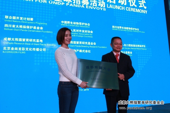 联合国开发计划署熊猫明星使者袁姗姗女士接受成都大熊猫繁育研究基地主任张志和博士颁发“成都熊猫大使”荣誉牌