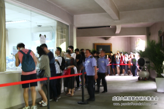 而作为2016年全球第一只出生的大熊猫宝宝的展出地,太阳产房也自然而然成了游客们的必游之地。大熊猫宝宝只在上午10:20-11:20以及下午2:30-3:30两个时间段展出,因此太阳产房玻璃房前早早地就排起了长龙。