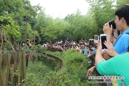 在园内观光车到达的第一站——月亮产房,正在活动场内的树上嬉戏打闹的2015级小团子们吸引了众多游客的目光。不断惊呼着“好可爱”、“It’s so cute”的中外游客们将活动场外的参观道围得水泄不通,纷纷拿出了自己的“长枪短炮”,尝试着找到最佳角度将这些“小可爱”萌萌的姿态记录下来。