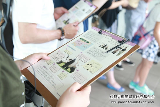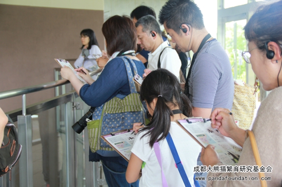 此次观摩的第二项活动是“熊猫课堂”。与“熊猫爱之旅”不同的是,“熊猫课堂”的第一部分在熊猫馆的活动场外进行。保育员分发给每位参与者一份资料和一副耳机,参与者可以戴着耳机,自由地在活动场外走动观看熊猫,根据耳机里保育员给出的提示,通过观察活动场里的大熊猫来寻找到资料上所列问题的答案。