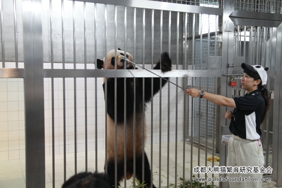 最后,大熊猫“海浜”惊喜出场,配合保育员为参与者们亲自示范了在没有辅助设施的条件下大熊猫是如何听从保育员指示棒的指示完成指定动作。