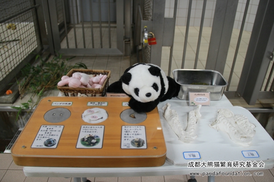 “熊猫课堂”第二部分仍然在熊猫馆室内工作区进行。参与者会在“讲师”保育员们的带领下参观兽舍,聆听保育员们讲解兽舍内的各功能分区。在展示台上,摆放着苹果、熊猫饼干和熊猫奶粉等实物,保育员向参与者们详细讲解白浜大熊猫们每日所摄入的食物。在活动最后部分,参与者们还可以近距离观察大熊猫的排泄物,了解大熊猫独特的消化系统。