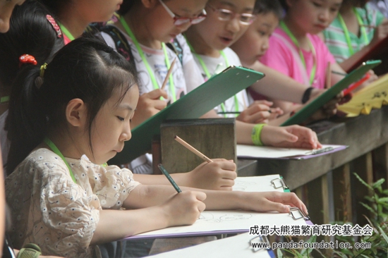 在我会科普教员的带领下,大家首先来到了熊猫基地内的幼年大熊猫别墅。在幼年别墅里,生活着七只两岁的大熊猫,当小朋友们看到大熊猫的一瞬间,立刻都被这些憨态可掬的国宝吸引住了,他们纷纷拿出了随身携带的画板和画笔,认真地描绘起大熊猫的各种姿态。