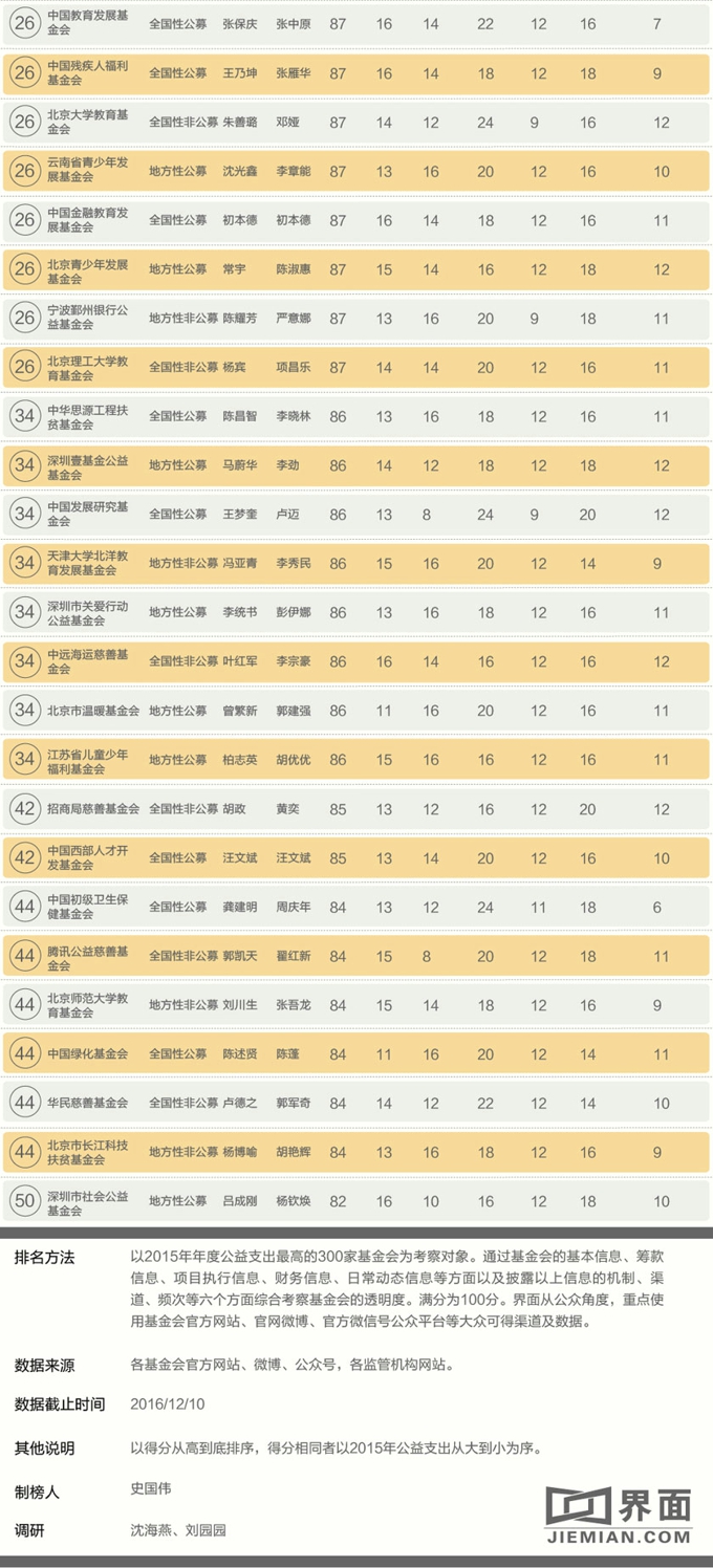 榜单的制作团队包括前福布斯中文杂志的榜单团队以及专业的会计师、财经分析师的参与,以保障最终产品的公正、独立、客观。界面以2015年年度公益支出最高的300家慈善公益基金会(最有支付能力的前300家基金会)作为候选,从基本信息披露、筹款信息披露、项目执行信息披露、财务信息披露、日常披露、披露渠道/频次等方面全面衡量一家基金会的透明度。界面从公众视角出发,不仅关注其披露内容,也关心官网网站、微博等自有平台的易用性和更新频率。
