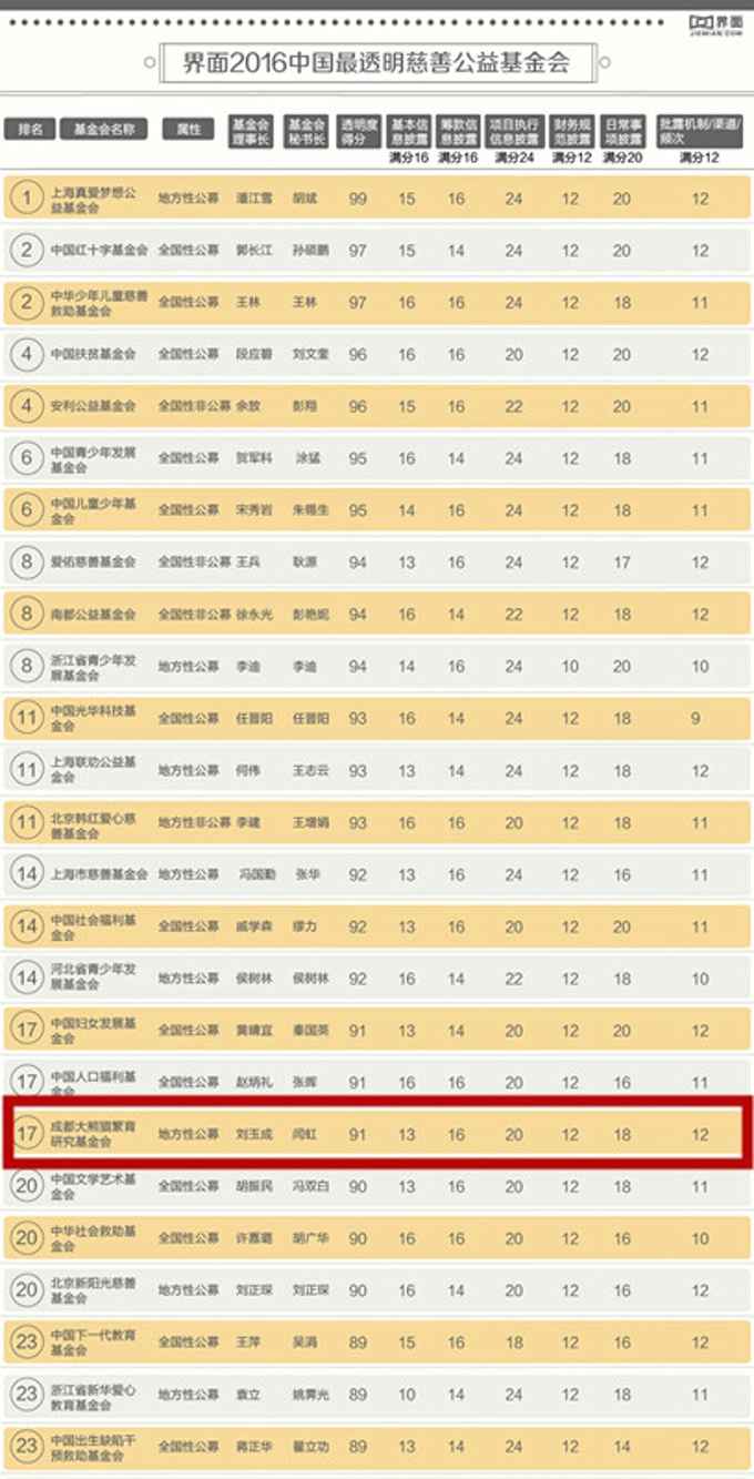 界面,作为中国领先的原创新媒体集团于2017年1月6日发布了第一份基金会榜单,即“2016中国最透明慈善公益基金会排行榜”。该榜单共有50家基金会入选,入榜者最高分为99分,最低门槛是82分,平均分为89分。我会透明度得分91分,作为四川省唯一上榜的基金会,排名为全国并列第十七位。