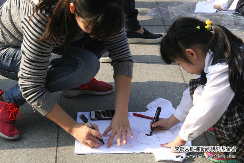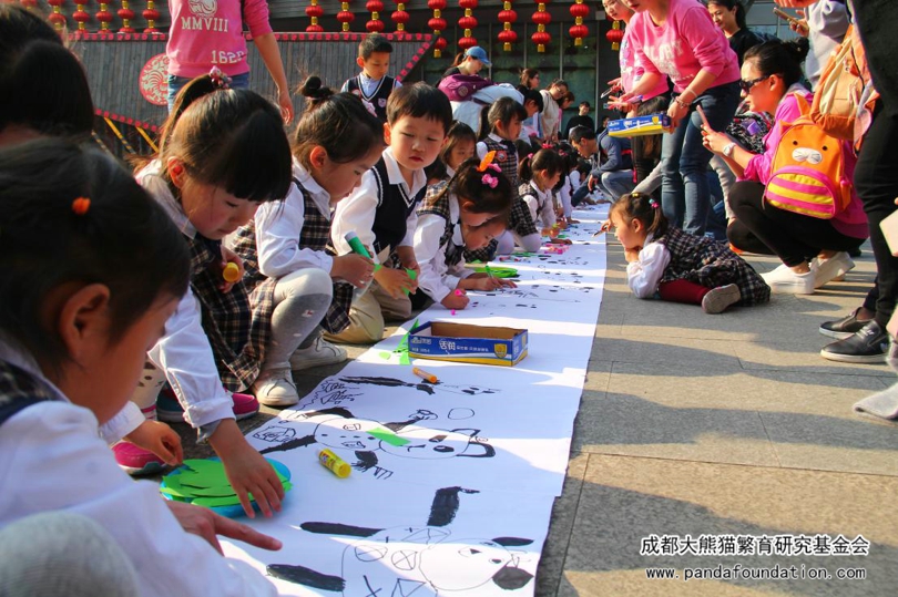 创作完成后,学生代表和家长老师门一起来到活动前台展示自己的爱心作品,这些作品也将作为他们的爱心见证一齐捐赠给我会。其中,熊猫画卷还将在我会熊猫画廊里进行长期展览。