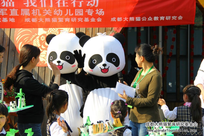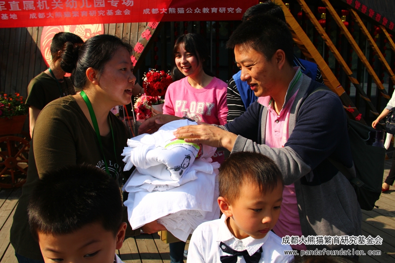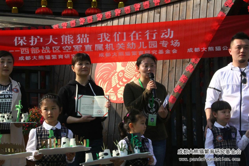 仪式最后,我会代表接过了西部战区空军直属机关幼儿园捐赠的8600元人民币及172名捐款同学名单,向园方代表开具了四川省公益事业捐赠统一票据和捐款证书。我会将于两个工作日内将同学们的名字登记在我会官方网站的爱心榜上以供查询。捐款仪式临近尾声,我会送给了同学们每人一份小礼品,在对同学们的爱心表示感谢的同时,希望可以鼓励同学们在今后继续关心、保护大熊猫,为大熊猫及其他濒危珍稀野生动物的保护献出自己的一份小小努力。