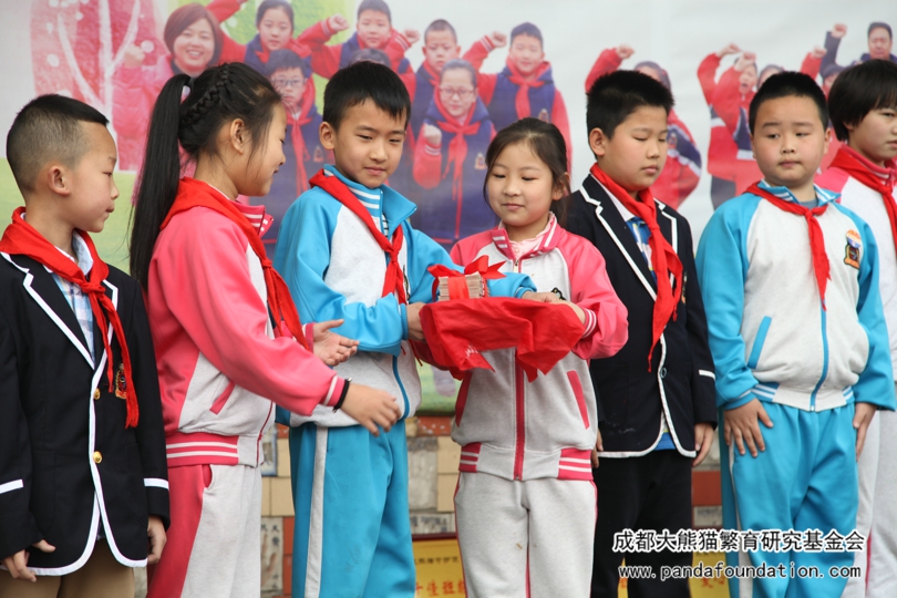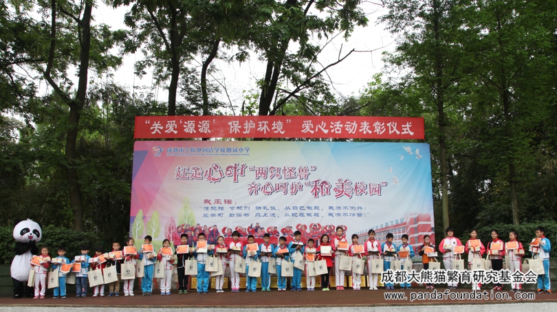 4月17日早上,隆重的升旗仪式后,60000元爱心捐款经成都三原外国语附属小学29名“爱心小天使”的手传递到我会工作人员的手中。这已经是三原附小认养大熊猫“源源”的第七个年头,我会工作人员为此准备了精美的纪念品送到同学们手中,并向全校师生表达了感谢。