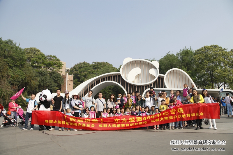 东方爱婴468中心的的老师,家长,以及孩子们在熊猫基地大门口合影