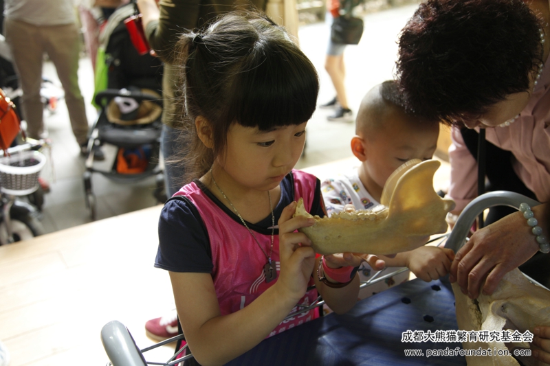 小朋友专心地研究着大熊猫头骨