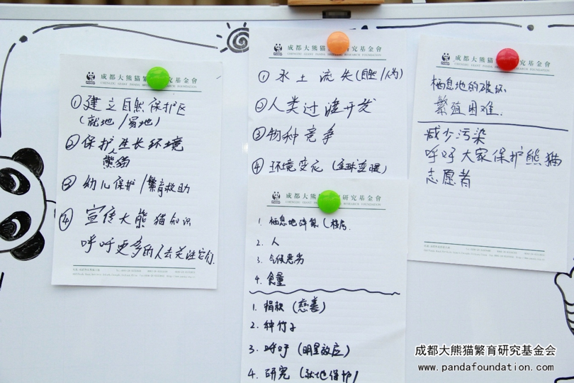 讨论结束后,科普教员将同学们的讨论结果收集起来,并进行了深入分析。通过分析,大家了解到,自然隔离和人为破坏等因素对大熊猫栖息地构成了极大威胁。而作为普通人,我们可以从身边的小事做起,保护环境关爱我们共同的家园就是在为保护大熊猫作出积极的行动。但这些保护行为应如何向公众推广?这一问题正是此次讲堂的核心——大熊猫保护宣传小能手工作坊要讨论的主题。