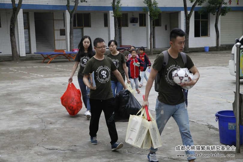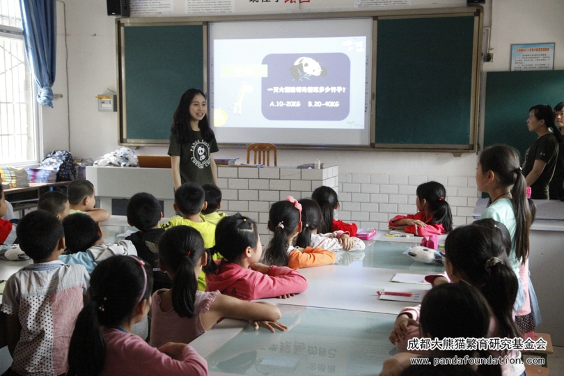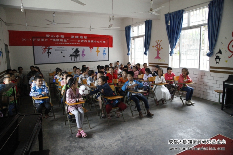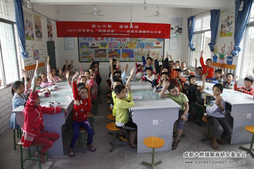 2017年9月27日,即国庆中秋双节到来前夕,“熊猫讲堂”来到了石湍镇中心小学。该小学位于四川省资阳市乐至县石湍镇,地属浅丘,经济发展主要以种养为主。在这里上学的孩子中大多数属于留守儿童,很少有机会走出去看外面的世界。因此,这次“熊猫讲堂”的到来正是为他们提供了一个拓宽他们眼界、了解大熊猫等濒危野生动物及相关保护知识的难得机会。