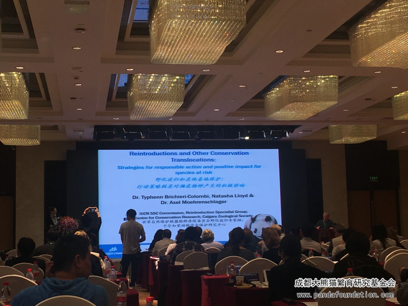 在来自加拿大卡尔加里动物园的与会代表带来报告《野化放归和其他迁地保护:行动策略及其对濒危物种产生的积极影响(Reintroductions and Other Conservation Translocations: Strategies for responsible action and positive impact for species at risk)》。报告介绍了由IUCN(世界自然保护联盟)出版、成都大熊猫繁育研究基地翻译的《世界自然保护联盟放归和其他异地保护指南》一书在物种易地保护发挥的指导作用,对易地保护策略选择、易地保护评估、保护目的与目标设置、放归对象、时间和目的地选择、放归准备工作、放归后的监测等多方面进行分析。