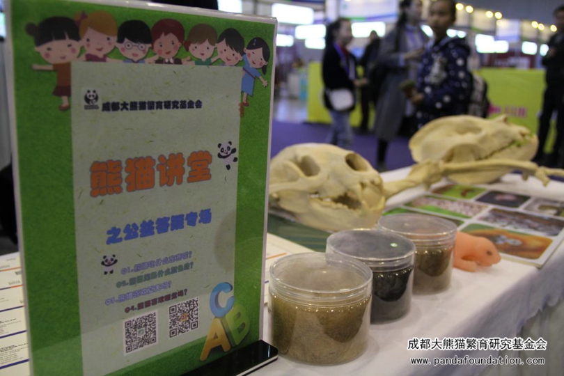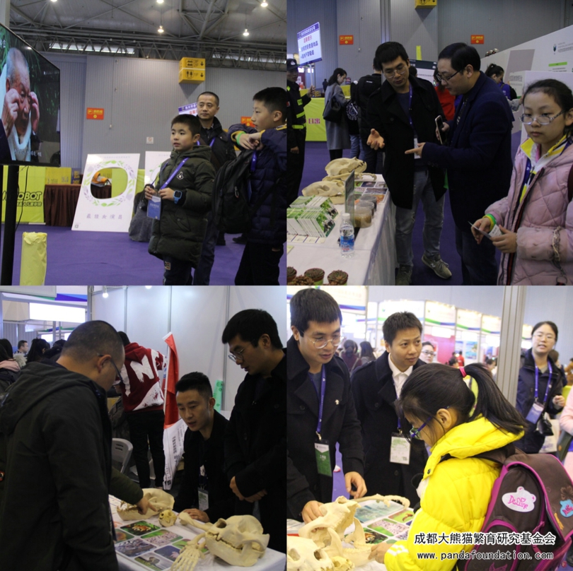 会场外展览区,我会科普教员同时进行着移动版“熊猫讲堂”,将平时所用教具如大熊猫幼仔模型、头骨模型、前爪模型、毛发等教具移到会场,为与会嘉宾答疑解惑,传递大熊猫保护相关科普知识。