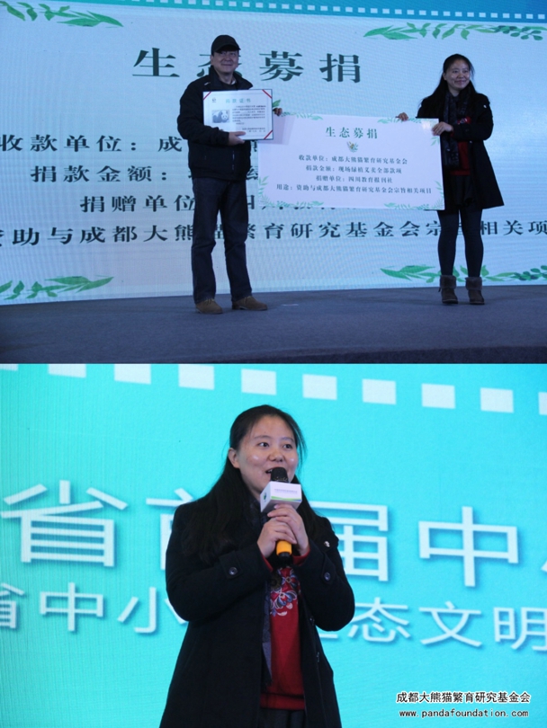 本次大会还进行了生态文明建设系列教育活动颁奖仪式、研学旅行启动仪式和生态环保捐赠仪式,四川教育报刊社将环保植物现场义卖活动所得款项捐赠于我会。我会代表接收捐赠,向四川教育报刊社颁发捐赠证书,并作了简短发言。