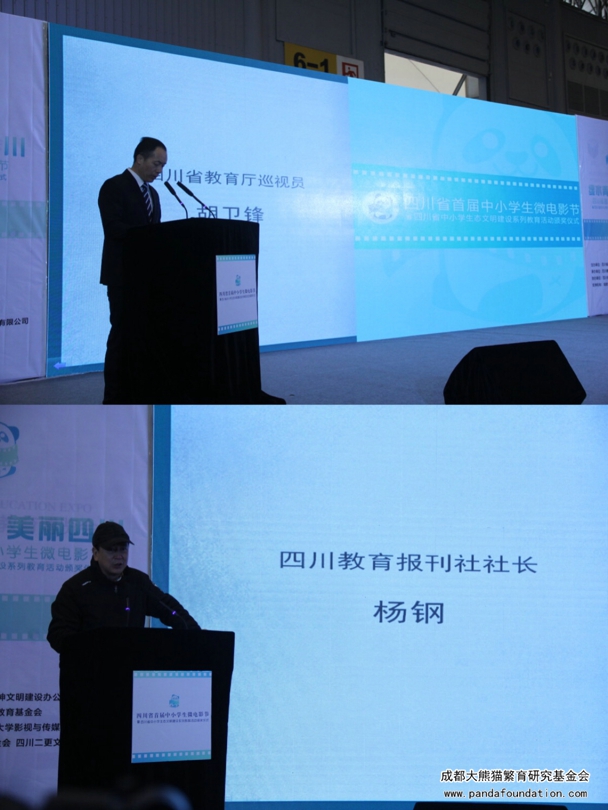 接着进行的是微电影颁奖仪式,四川省教育厅巡视员胡卫锋、四川教育报刊社社长杨钢分别发言,发言中对我会所参与的工作给予极大肯定。