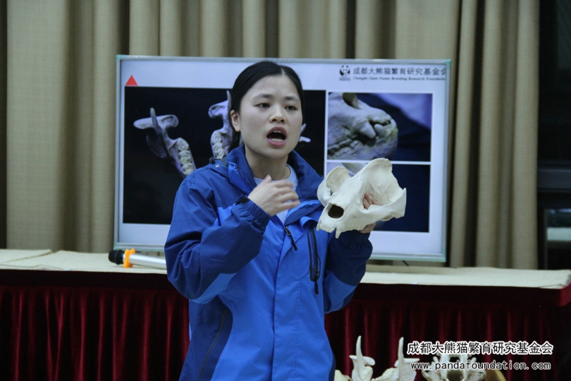 讲解经验丰富的英语讲解员灵活的运用身边的道具为我们讲解大熊猫头骨和亚洲黑熊头骨的差异以及原因。