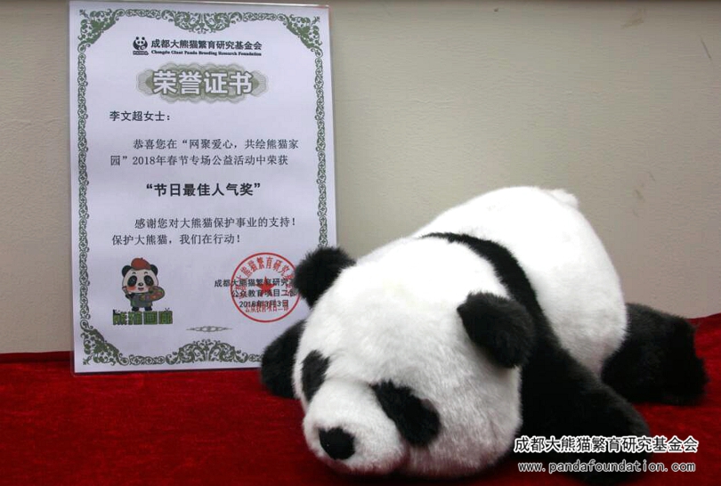 2018年春节大假期间,我会首次开展了“网聚爱心,共绘熊猫家园”——“网上评画”2018年春节专场活动。经过8天投稿和15天的投票环节,最终有6名参赛者的作品从中脱颖而出,获得“活动最佳人气奖”。这6名获奖者将获得由我会赠送的限量版定制熊猫公仔——“雅竹”一个,同时还将获得此次活动的荣誉证书。