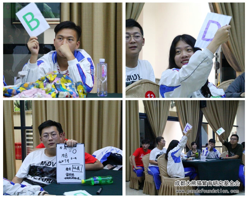 下午雨势稍歇,经过中午的休息之后,到了最激动人心的“熊猫讲堂”——答题环节。值得一提的是,本次活动采用积分制,加上之前的游园任务和海报制作,每个小组都会根据本组活动完成情况得到相应的分数,所有活动结束后,得分最高的小组成员们将获得精美礼品。答题环节包含了16道关于大熊猫的问题,每道题都是一个小挑战,同学们为了不让本组分数落后,都全力开动自己的“小宇宙”。