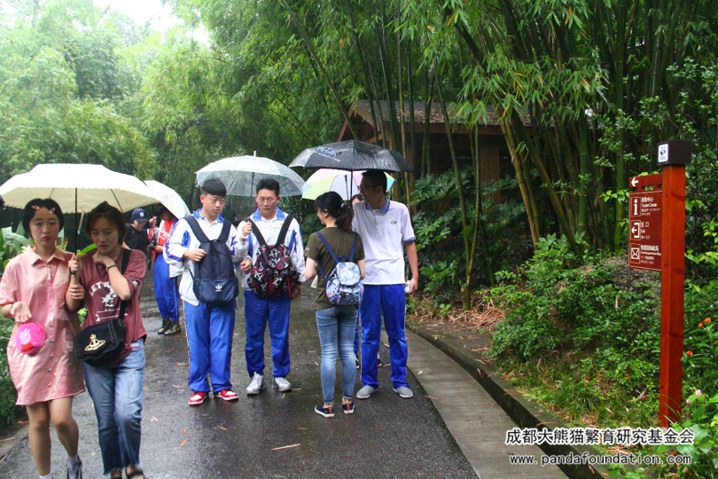 来自成都七中万达学校国际部的同学们一大早就来到了成都大熊猫繁育研究基地门口,在我会科普教员的指引下集合、进行分组。夏季的天就像婴孩的脸说变就变,刚刚还是晴空一片,转眼间雨滴便洒落。在教员们简单地介绍完游园活动任务后,同学们迫不及待地开始了“熊猫基地探索之旅”。