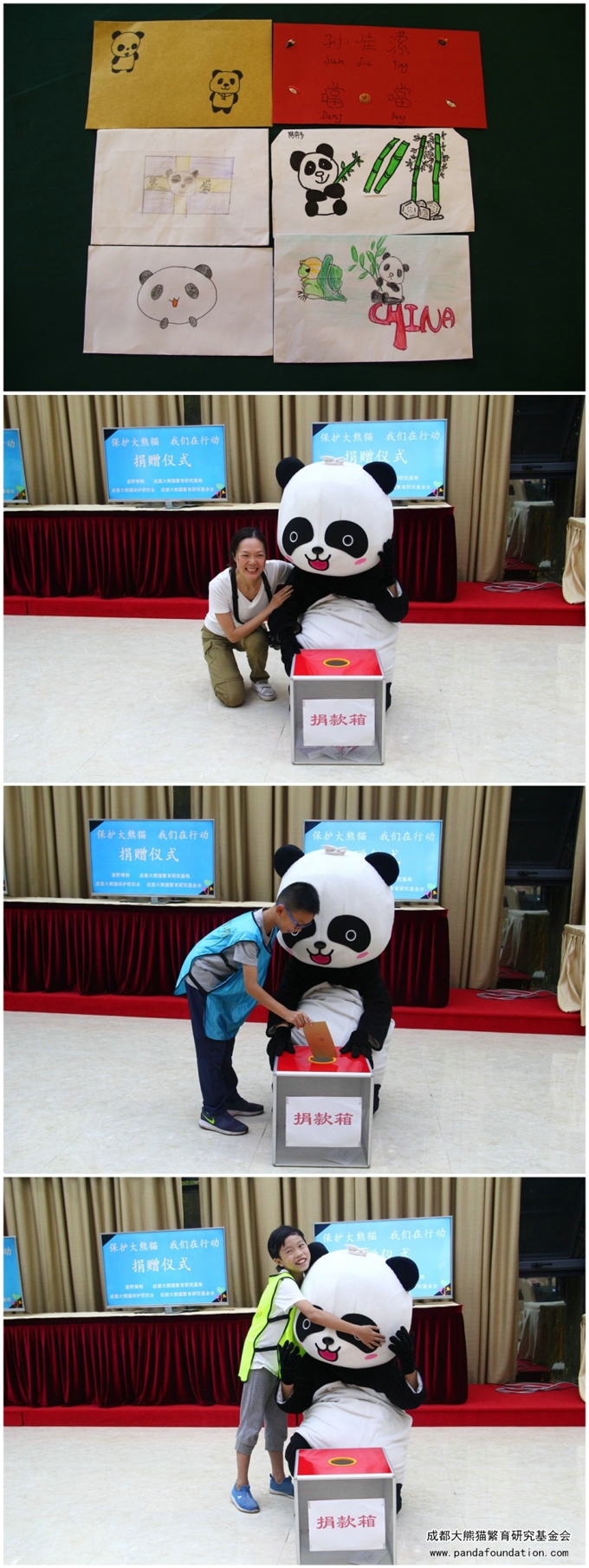 讲堂之后,进行了捐赠仪式。在现场,大家将爱心捐款放入自己精心设计的信封,依次投入熊猫爱心大使“兜兜”的捐款箱里。