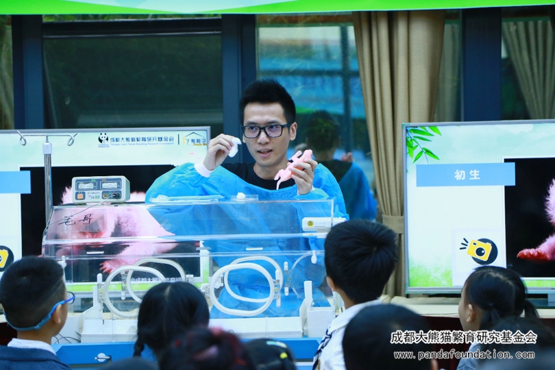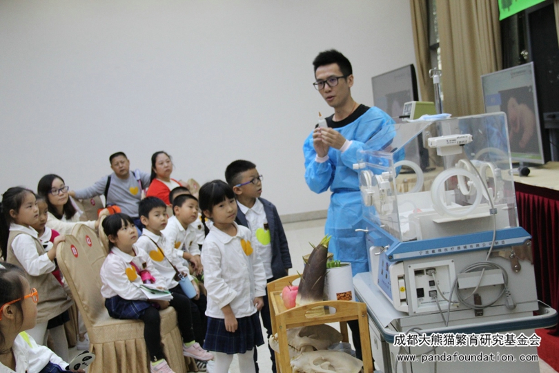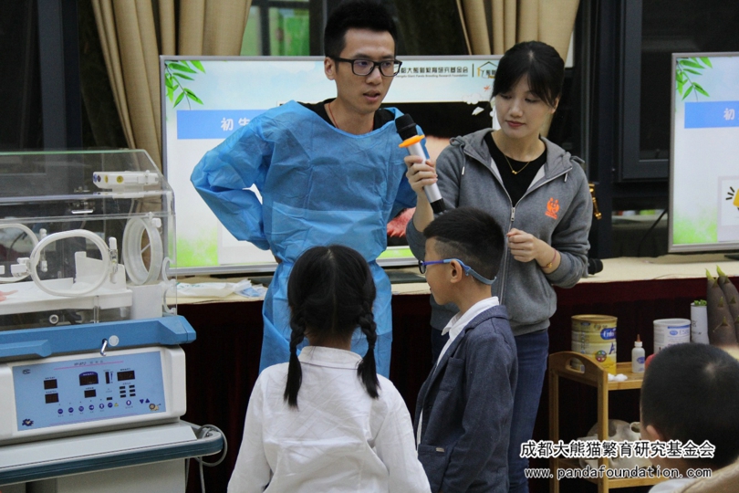 本次讲堂还设置了“小小饲养员”环节。科普教员邀请两名小朋友作为“小小饲养员”,协助他照顾“熊猫宝宝”——幼仔模型,让小朋友们了解日常饲养员照顾幼仔的情形。