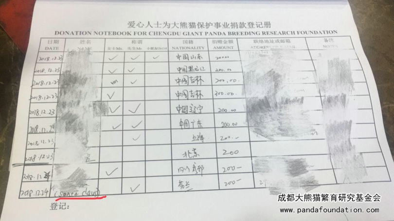 12月23日下午,我们的工作站已经关门,正当工作人员盘点今日工作时,门外传来一阵敲门声。打开门,是一位成都本地的游客,她说她想要帮圣诞老人给大熊猫捐款。经过一番交流后才知道,原来来自芬兰的正牌圣诞老人正在成都参加活动,她希望以圣诞老人的名义捐款给大熊猫。
