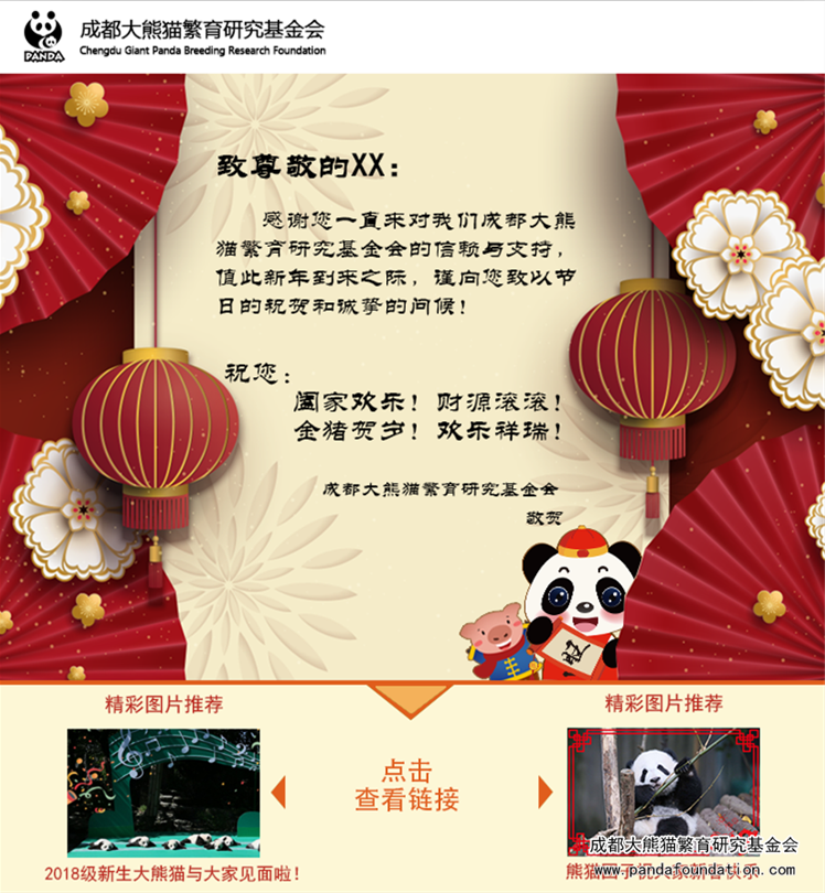 新春贺卡收录了成都大熊猫繁育研究基地2018年新生大熊猫见面会图片集和它们的成长图片集链接,让身在外地的爱心人士们每年都能了解到熊猫基地新生宝宝的成长情况。正因为长期受到来自社会各界爱心人士的关爱,熊猫宝宝们才能一天天茁壮成长起来。