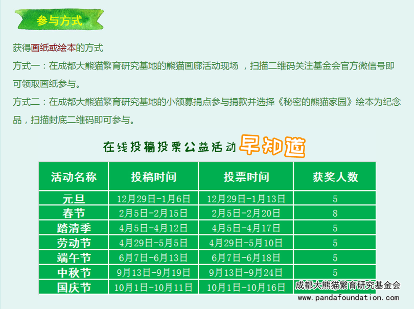 踏青季期间,我会携手成都大熊猫繁育研究基地,在园区内开展了为期3天的“熊猫画廊”公益活动。我们以大熊猫为主题,以绘画方式为媒介,将大熊猫的科普知识融入到绘画中去,让大家能更加直观深入地了解和关注大熊猫的生存现状及其保护现状,提高公众保护意识,激发保护热情。