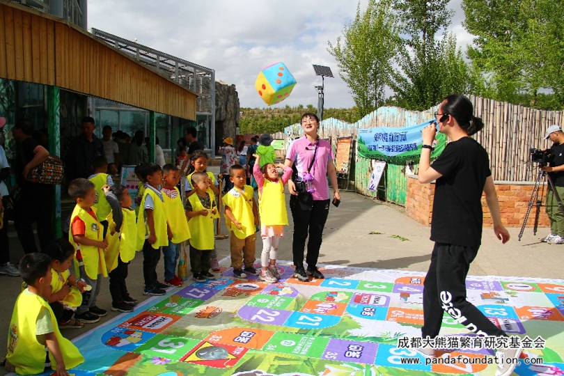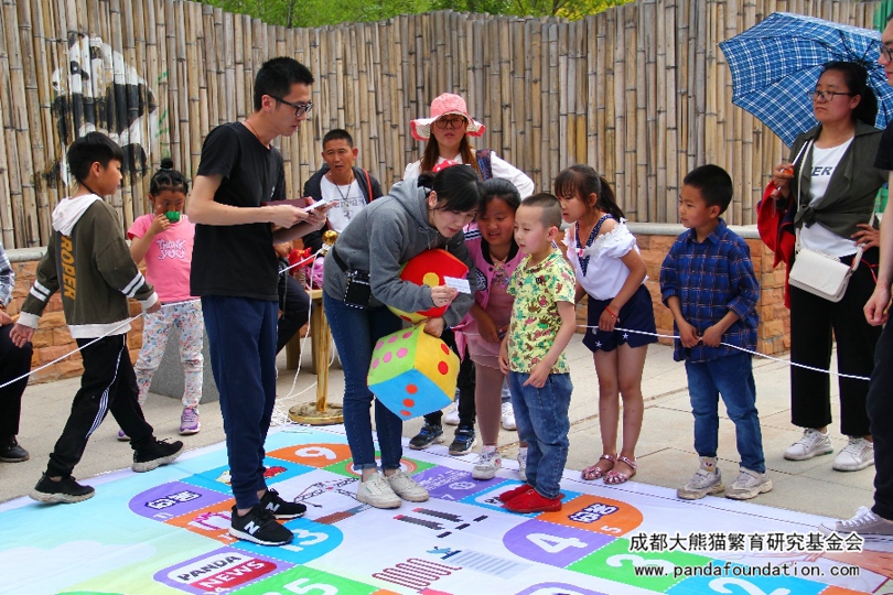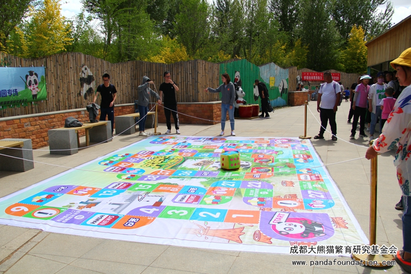 一旁的科普游戏区设置有“奔跑吧,熊猫”和“熊猫蹲”游戏,吸引着往来的游客们。参与的小朋友们通过挑战“奔跑吧,熊猫”里设置的大熊猫相关问题,掷骰子前进或后退,抵达游戏中设置的终点取得胜利。