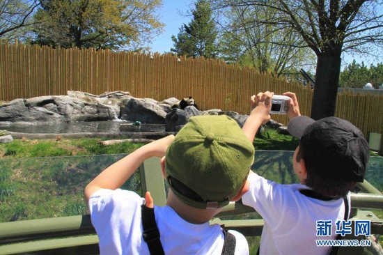 两名小朋友在加拿大多伦多动物园观赏和拍摄大熊猫大毛