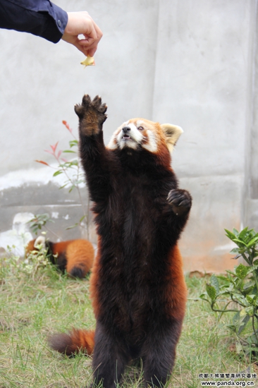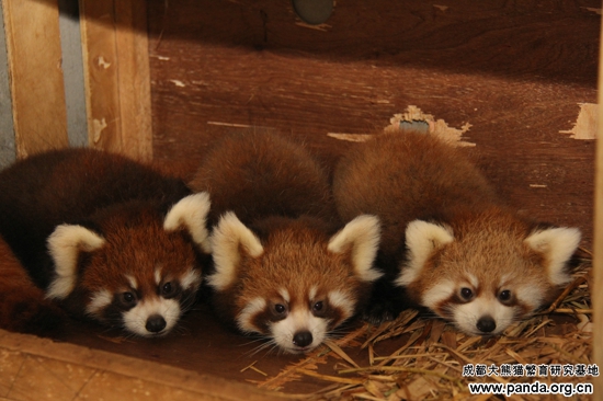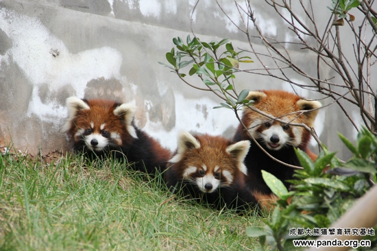 成都大熊猫繁育研究基地现有小熊猫80只,2012年繁殖13胎成活17只。其中一胎是三胞胎,这是成都大熊猫繁育研究基地首次自然繁殖育幼成活的三胞胎,现在已经8个月大了,在妈妈的悉心呵护下,兄弟仨个个身体棒棒。小家伙们的妈妈很年轻,长的圆鼓鼓,走起路来摇摇摆摆,十分惹人喜欢,饲养员们都亲切的称她为“大胖子”。