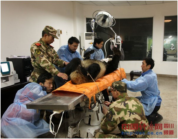 由于当地大熊猫救护设施简陋,在初步诊断和简单护理后,连夜将该大熊猫运往中国保护大熊猫研究中心——大熊猫野化放归培训基地救治。到达卧龙基地后,兽医立即为这只体弱的大熊猫输上葡萄糖和盐水为其补充能量。