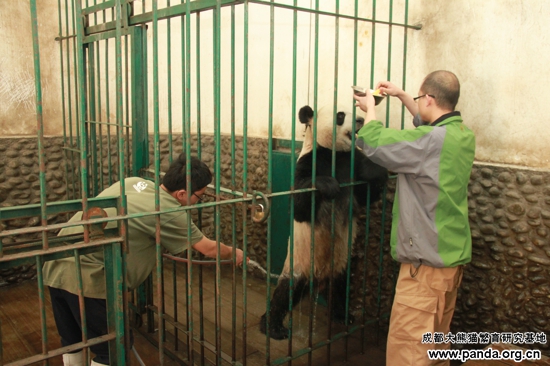 熊猫基地工作人员开始为大熊猫“大毛”洗澡