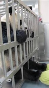 脚部定点训练项目内容,是希望当大熊猫看到训练员的指令后,可以把双脚乖乖地放在训练员的膝盖上;大家不要以为这个动作一看就懂或很容易,这就不对了,对于不能用语言进行沟通的动物行训练,是需要耐性的;“开开”刚进入训练笼练习脚部定点项目时,有时候都会摸不着头脑,直到现在只要训练员轻拍自己的脚,开开就知道要乖乖地坐好并把双脚伸出。