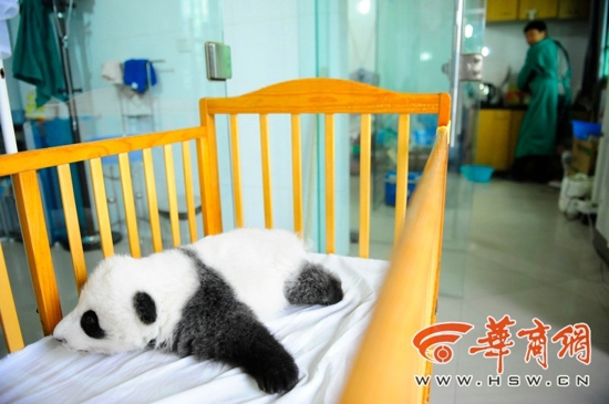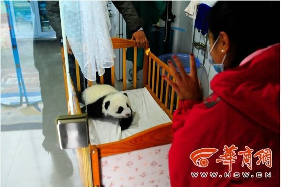 “女宝宝”爱干净是必须的,“嘘嘘”完后,杨创学用纸小心地帮它擦干净,才把它抱回床上,并让它靠栏杆坐着。可小家伙似乎不大喜欢坐,向后蹭了两下,便四脚朝天躺倒了。躺下后它又左右扭摆着想爬起来,但怎么使劲都不得要领,右前爪和小嘴巴卡在了婴儿床的栏杆里,便发出“吱吱”的叫声向饲养员呼救。“它这么躺着不舒服,想让我把它抱起来。”杨创学说着抱起熊猫宝宝。