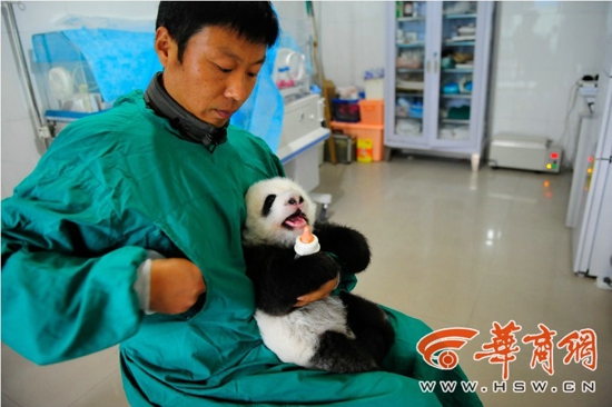 吃饱后,杨创学像母亲抱孩子一样,将熊猫宝宝竖着抱起,轻轻拍着它的后背,直到熊猫打了饱嗝,才把它放进婴儿床。他说,这只宝宝的妈妈“欣欣”是第一次生宝宝,还没带孩子的经验,只好人工哺育,每天上午和下午,他们都会先用蜂蜜安抚妈妈,再人工挤奶,从“欣欣”那里收集母乳。等到宝宝半岁时,就能断母乳,靠奶粉喂养到一岁便开始学吃竹叶了。