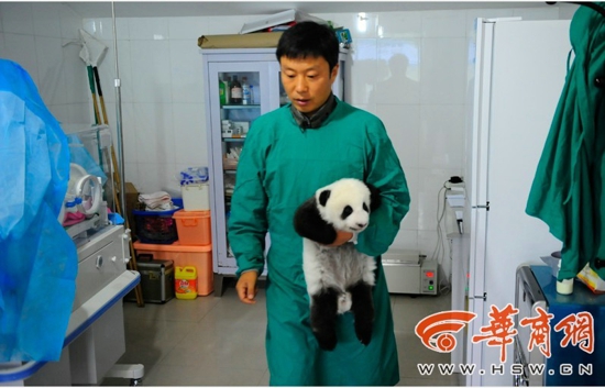 饲养员还有一项重要工作,就是定期将熊猫宝宝抱出笼舍,测量体温和体重。给新生大熊猫测体温,不是测腋下,而是测它又软又毛茸茸的肚子,因为它肚子的体温更恒定。