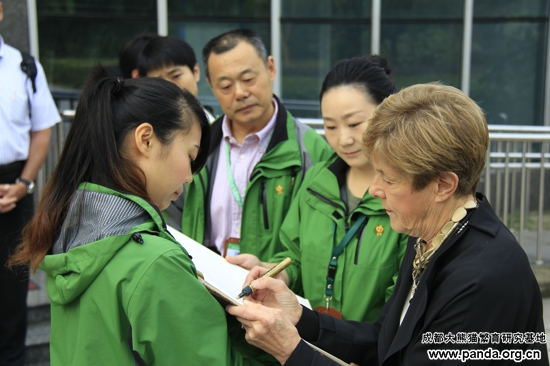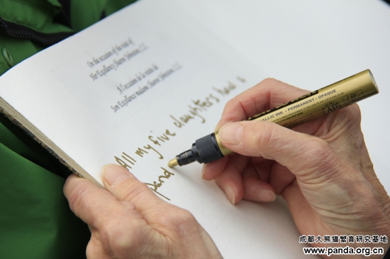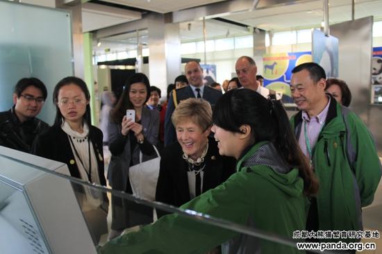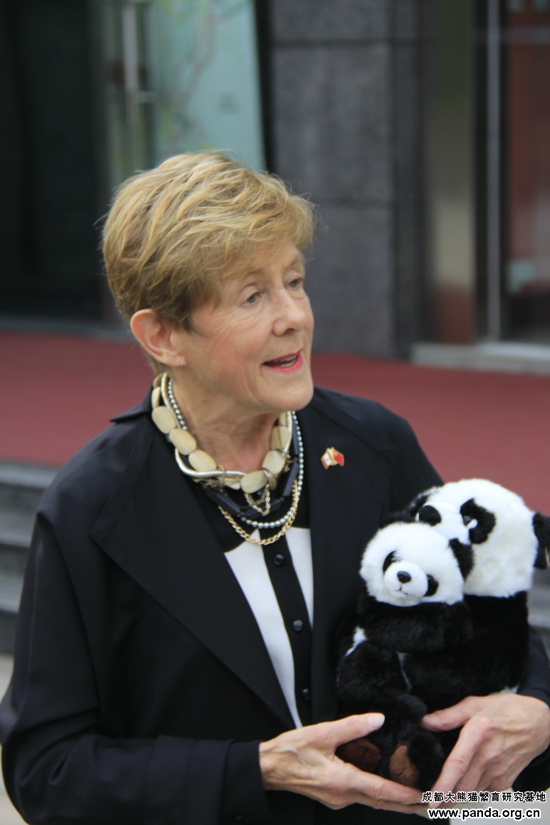 2013年10月23日上午9时,加拿大总督夫人宋雯女士一行来到大熊猫繁育研究基地,基地工会主席钟培成热情迎接宋雯女士的到访。首先,宋雯女士在基地工会主席钟培成的陪同下来到大熊猫探秘馆进行参观。在这里,宋雯女士一行通过工作人员的介绍和探秘馆中展示的图片以及视频资料了解了成都大熊猫基地发展历史和保护大熊猫这一濒危物种的重要性。参观完大熊猫探秘馆后,她兴致勃勃的在基地的留言薄上留下了她此时此刻的心情。当得知住在加拿大多伦多动物园中的一只大熊猫是来自这里,她非常激动。她感谢熊猫基地给加拿大人民带去的不仅仅是活泼可爱的大熊猫,更带来了来自中国的问候和中加人民的友谊。随后,宋雯女士来到太阳产房看到大熊猫宝宝,她非常激动的对身边的工作人员说:“这真是神奇和可爱的动物,这是我所看见过的最可爱的动物,我深深被他们吸引。”