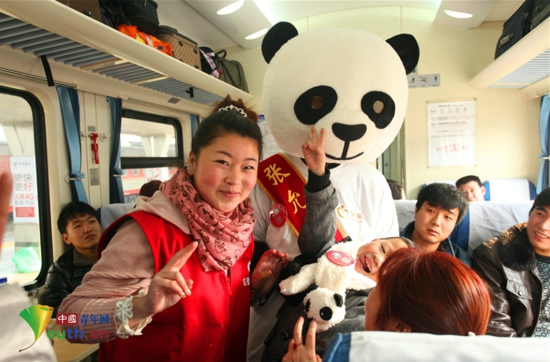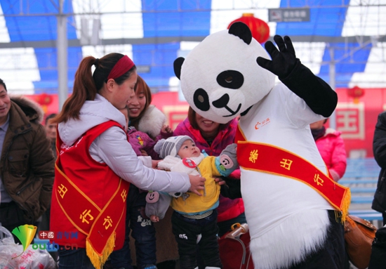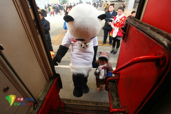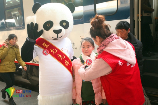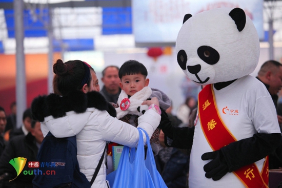 1月23日(腊月二十三)是中国传统的小年,在成都火车站临时候车室、站台上、列车里一只身披红色绶带、手拿熊猫围脖的大熊猫上串下跳的格外引人注意。在寒冷的冬季,这只熊猫为乘坐列车出行的小朋友围上一根特制的熊猫围巾,为他们出行送上冬日的一丝暖意。
