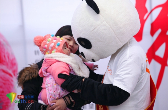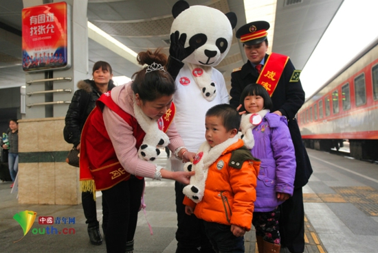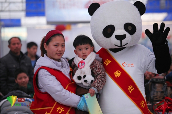 1月23日在成都火车站临时候车室里,熊猫哥哥与志愿者们正在为小朋友围围脖。