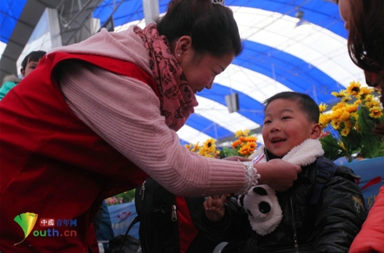 1月23日在成都火车站临时候车室里,青年志愿者正在为小朋友围围脖。
