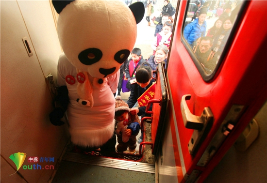 1月23日在成都开往宁波的K424次列车上,熊猫哥哥送返乡的小弟弟上火车。