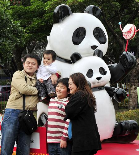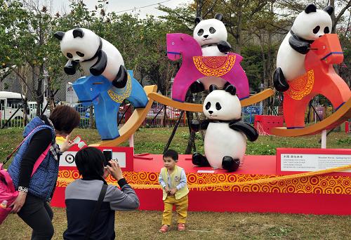 2月2日,游人在圆仔主题景观造型前拍照。春节期间,台北花博公园推出“圆仔迎春 三戏牡丹”花画联展,并为即将举行的元宵灯节设置以大熊猫圆仔为主题的“怀旧童玩灯区”,吸引众多市民前来观赏。新华社发(吴景腾 摄)