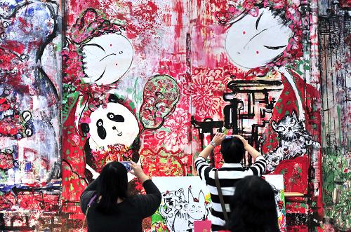 2月2日,游人在观赏“圆仔迎春 三戏牡丹”系列画作。新华社发(吴景腾 摄)